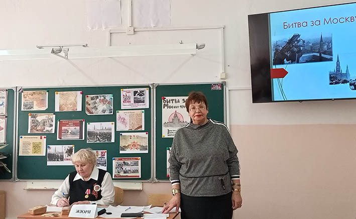 Волонтёры, выполнявшие роль жюри, сначала оценивали внешний вид участников конкурса, эмблемы и визитки команд, выполнение заданий по карточкам. А затем была проведена интерактивная викторина «Битва за Москву». Урок мужества получился комбинированным и познавательным. Ученики были инициативны, с интересом задавали вопросы и делились своими мыслями, исполняли песни, читали стихи. В свою очередь Валентина Дмитриевна Константинова преподнесла им и всем участникам встречи собственный музыкальный подарок, исполнив «Песнь о солдате» М. Агишиной и В. Мигули.