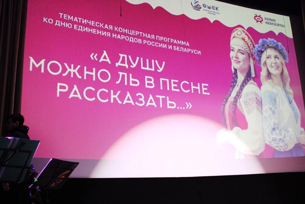 Образованному волей братских славянских народов Союзному государству Беларуси и России 2 апреля текущего года исполнилось 30 лет. Этому историческому событию в Концерт-холле Регионального центра по связям с общественностью была посвящена тематическая концертная программа «А душу можно ль в песне рассказать…», подготовленная по инициативе Местной национально-культурной автономии «Омские белорусы» при поддержке регионального министерства внутренней политики, других областных ведомств и общественных организаций, а также Фонда президентских грантов. В гала-концерте выступали артисты музыкальных и танцевальных коллективов Омского Дома дружбы, Омского колледжа культуры и искусств, в фойе зрителей развлекали исполнители образцового фольклорного ансамбля «Дивно».